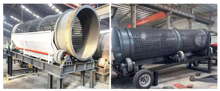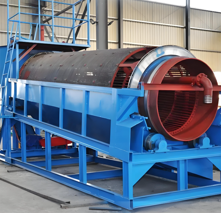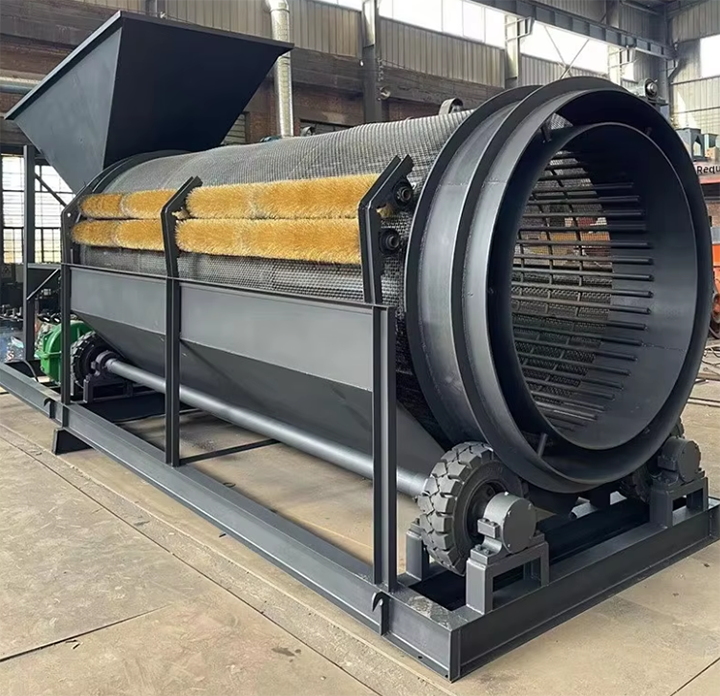 当其启动时,电动机经减速器与滚筒装置通过联轴器连接在一起,驱动滚筒装置绕其轴线转动。当物料进入滚筒装置后,由于滚筒装置的倾斜与转动,使筛面上的物料翻转与滚动的同时,自上而下通过分级筛网析出,由于筛网规格不同,物料直接被分离筛选,合格物料(筛下物)经滚筒外圆的筛网排出,不合格的物料(筛上物))经滚筒末端排出。由于物料在滚筒内的翻转、滚动,使卡在筛孔中的物料被弹出,可防止筛孔堵塞。